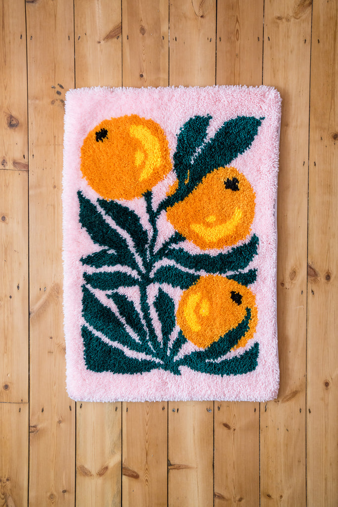 This kit includes everything you need to create a juicy orange design with vibrant forest green leaves that'll transport you straight into the heat of a sunny Sicilian summer. With bold graphics set on a fun pink background, this large kit is an easy and stylish way to learn the craft of latch hook rug making.