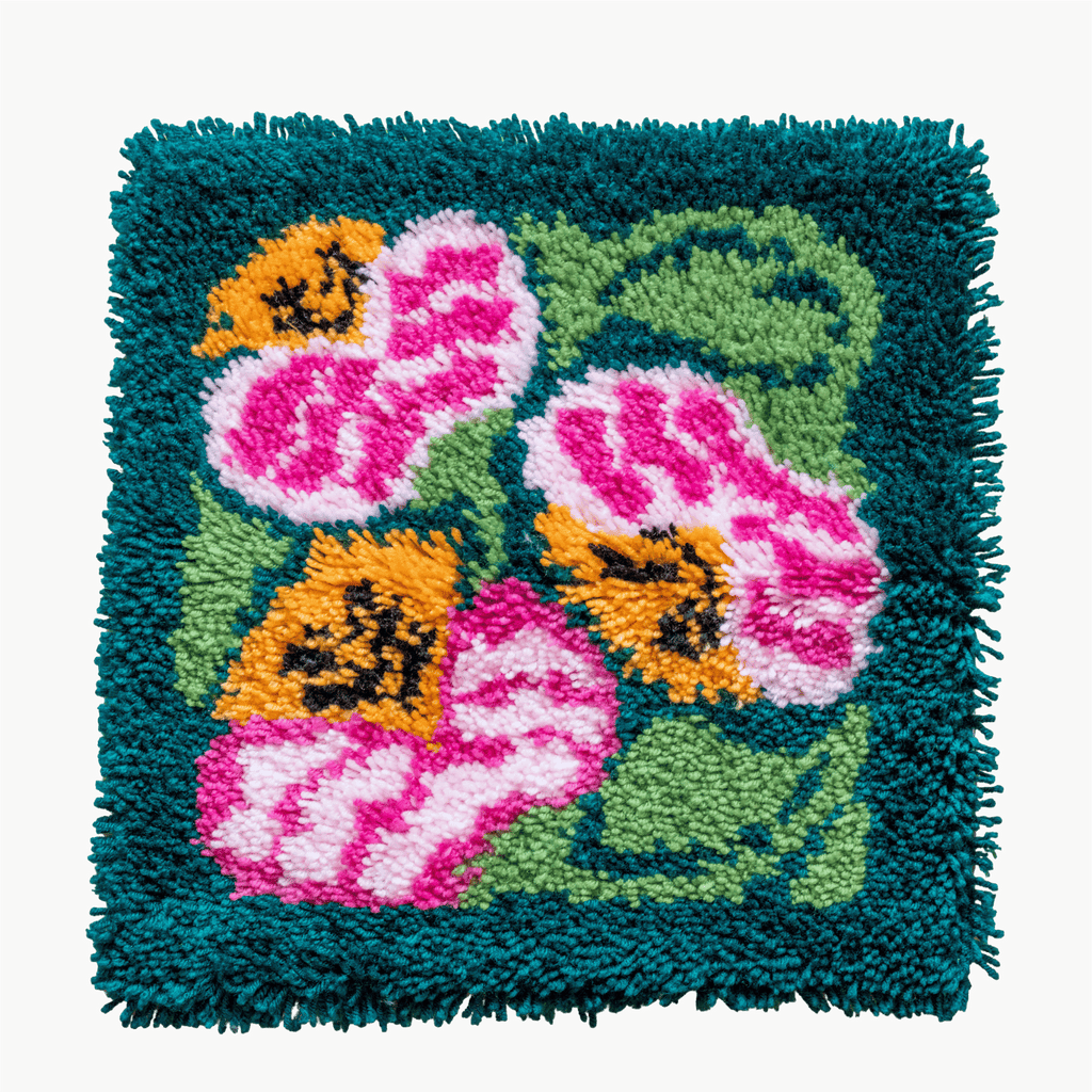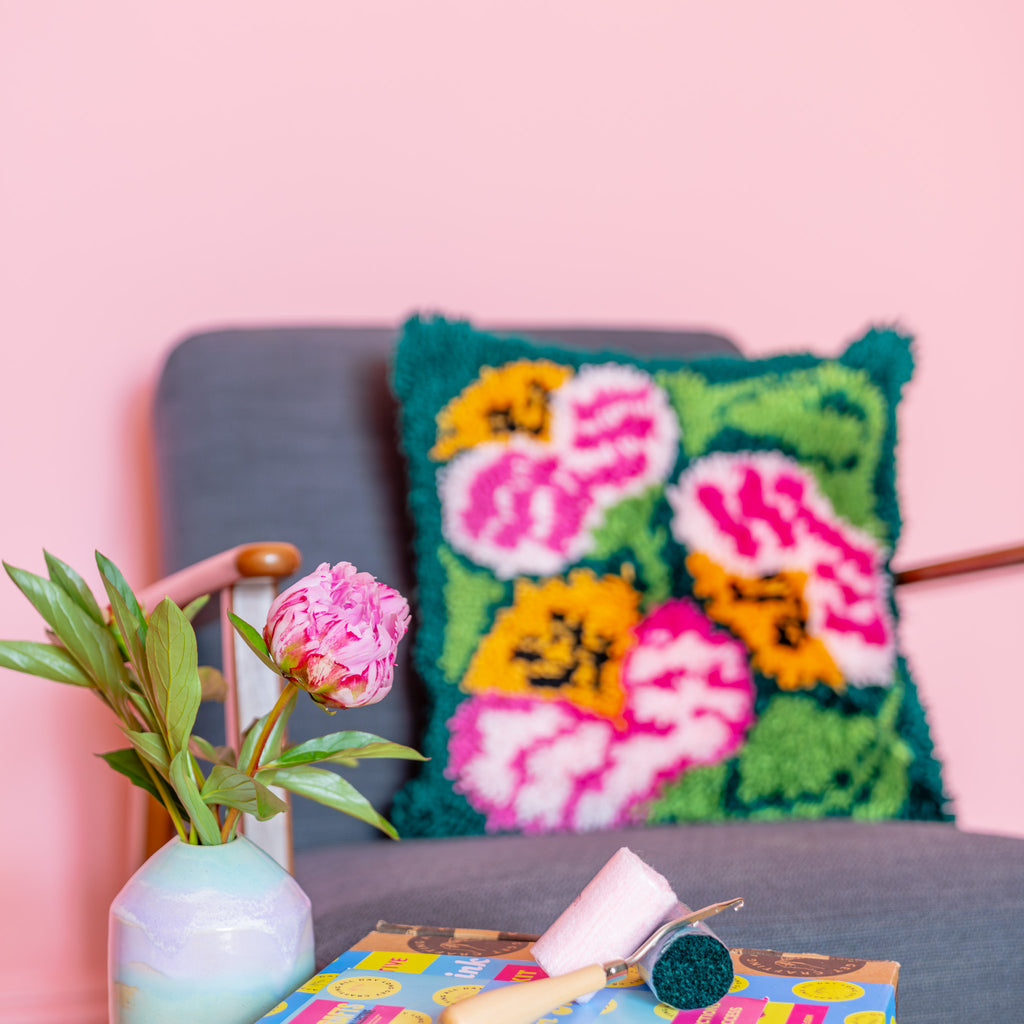 Craft a burst of floral fun using our Riotous Bouquet latch hook kit. Featuring a lively array of bold pink and orange blooms with striking black accents, it’s set on a rich teal background - in other words, it’s a riot of rich, jewel-like colours.